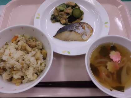 たけのこごはん・牛乳・魚の照り焼き・わかめのおろし和え・すまし汁