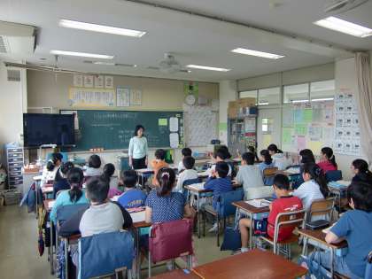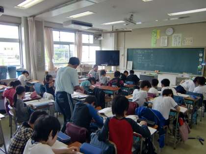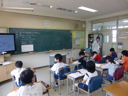 5年2組、4組、算数ルームでは算数。「単位量当たりの大きさ」の学習をしています。