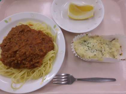 ミートソーススパゲティ・牛乳・ポテトのクリーム焼き・くだもの