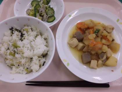 青菜とじゃこのごはん・牛乳・新じゃがのそぼろ煮・野菜のゆかりかけ