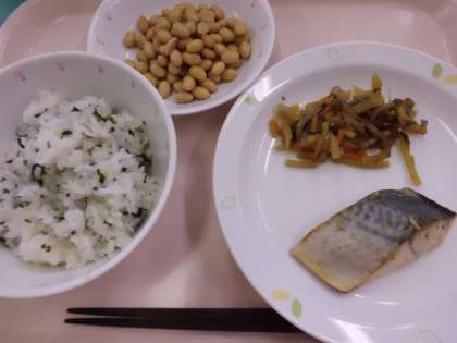 わかめごはん・牛乳・魚の西京焼き・ぶどう豆・じゃがいものきんぴら