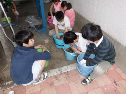 5年生は、総合的な学習の時間にバケツでの稲作りに挑戦します。