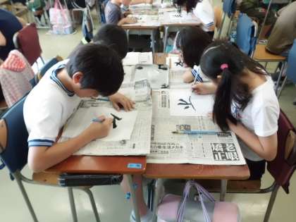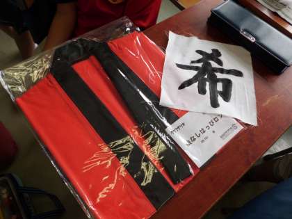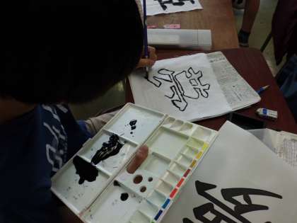 今日は、はっぴの背中に貼る漢字を布に書きました。