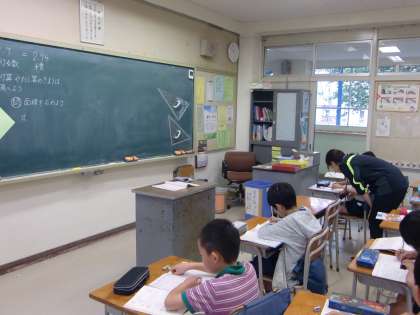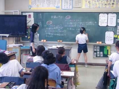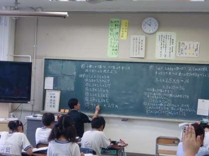 5年2組、4組、算数ルームでは少人数算数の授業です。小数でもかけ算の決まりが成り立つかどうか確かめました。