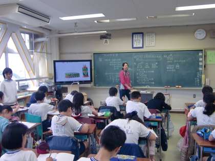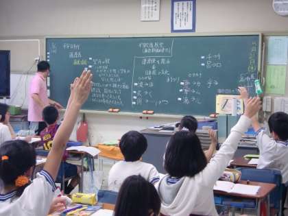 6年1組は社会。平安時代の文化について学習しています。漢字がどんなひらがなやカタカナに変わったかを、推理しました。