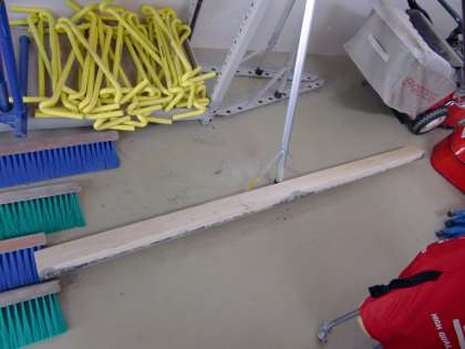 運動会のトラックのライン引き、特にカーブ部分を引くのは、なかなか苦労するものです。今回、千歳小に新たに登場した特殊アイテム、それは、トンボ(校庭整地用の道具)の下に取り付けられた三本のねじです。内側のラインに沿ってトンボを引っ張ると、このねじが地面をひっかき、ライン引きの目安となるわけです。主事室特製のアイテム、当日も大いに活躍することでしょう。