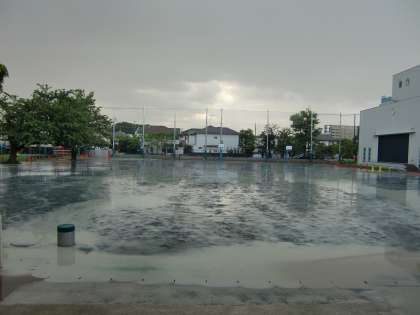 雨で校庭が水浸しに