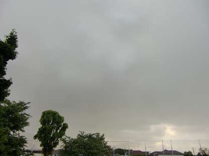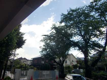 2校時あたりから空の色がグレーに変わってきたのですが、3校時の途中から激しい雨が降ってきました。雷も鳴っている一方で晴れているところもあります。