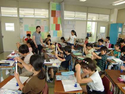 4年4組は理科。筒にとじこめた空気に力を加えると、どのようなことが起こるのかを確かめました。