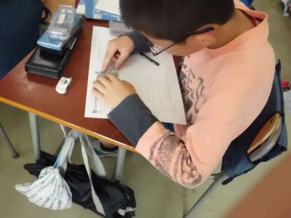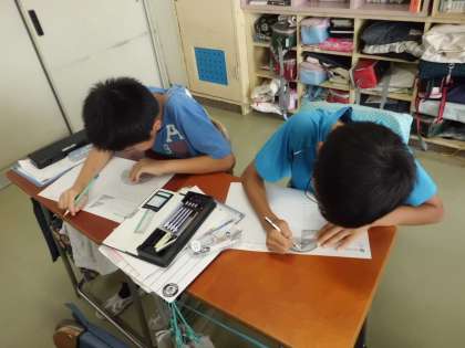 合同な図形を書いたり、三角形の角の性質を調べたりしています。