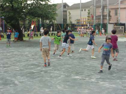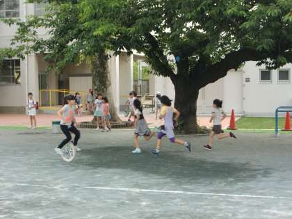 本校では、毎朝校舎内に入る8時5分までの間、事前に保護者の方の届け出があれば、校庭で遊ぶことができます。中休みや昼休み以上にのびのびと遊んでいる子どもたちです。