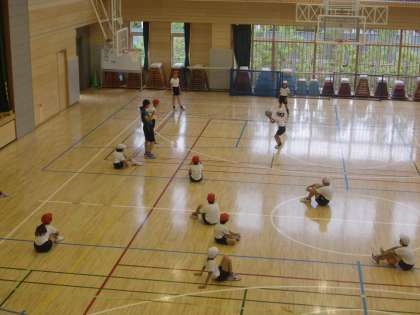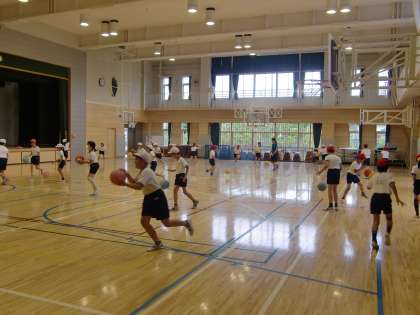 5年3組は体育館体育。バスケットボールを使った学習です。
