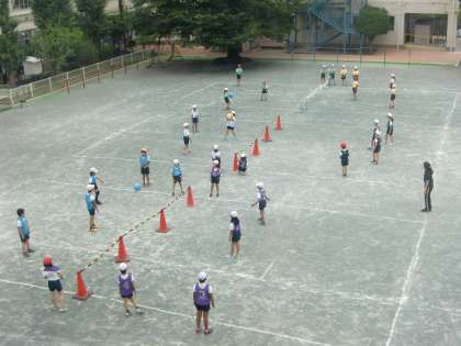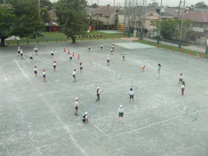 校庭では、3年1組と3組が「プレルボール」というボール運動の学習中です。