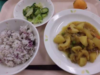ゆかりごはん・牛乳・カレー肉じゃが・野菜のごま風味・くだもの