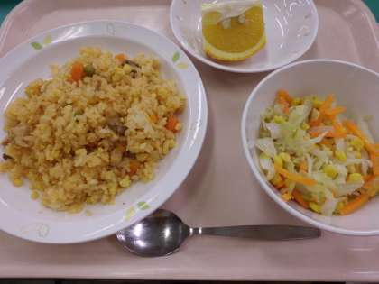 たまご入りチキンライス・牛乳・コーンサラダ・くだもの