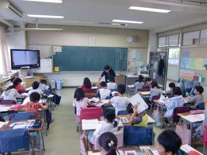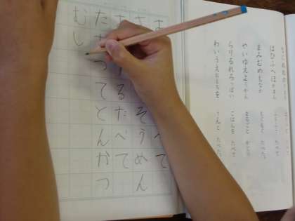 1年3組は国語。詩「あいうえおにぎり」をノートに書き写しています。