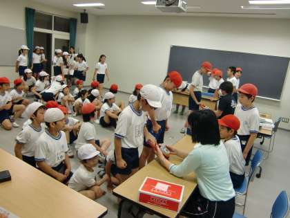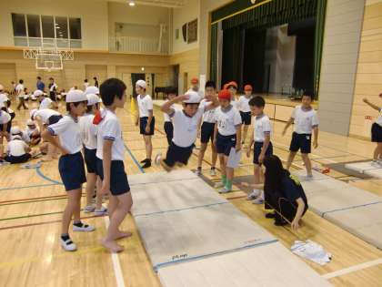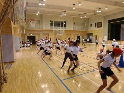 昨日まで行っていたシャトルランに加えて、今日は5・6年生が握力、長座体前屈、反復横とび、立ち幅とびを行いました。