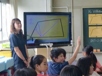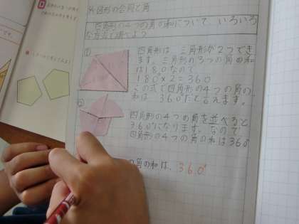 今日は、四角形の内角の和が360度になる理由をみんなで考えた後、そのことを利用して問題を解きました。