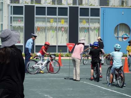 警察の方に自転車の点検の仕方、道路の横断の仕方、右折の仕方など教えていただきました。実際に自転車に乗り、体験もしました。