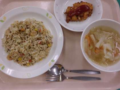 ナシゴレン・牛乳・キャベツスープ・大豆とコーンのフリッター