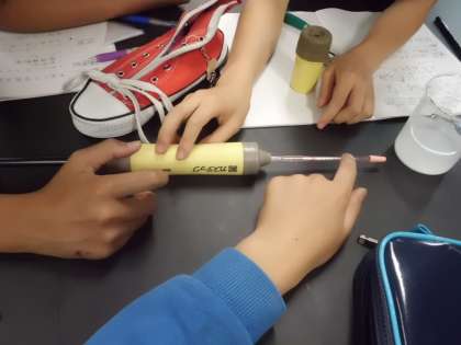 理科室では6年1組が、吐きだした空気について調べる実験中です。
