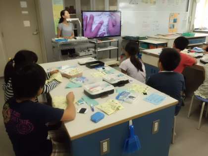 家庭科室では5年4組が、家庭科、裁縫の授業です。