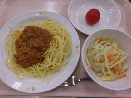 ミートソーススパゲッティ・牛乳・じゃがいもハニーサラダ・くだもの