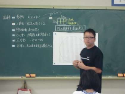 今まで学習した図形の面積を求める公式の復習から授業が始まりました。方眼に描かれた円の場合もいろいろな求め方が出てきました。