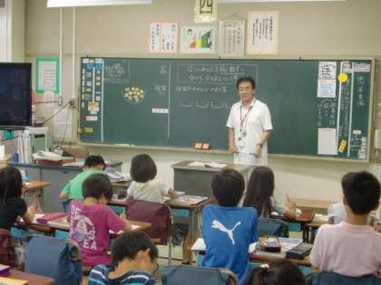 今日から新しい計算の登場。12個のみかんを4人に同じ数ずつ分けると一人分は何個という問題場面です。図を描いたり、みかんを動かしたりして考えます。