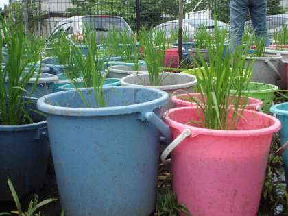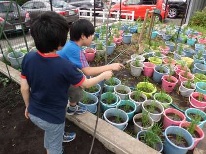 水やりをしている児童に「どのくらいの高さになったかな」と聞くと、