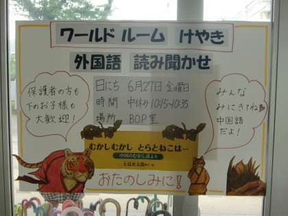 「ワールドルームけやき」にかかわっている、もしくはかかわっていたことのある保護者の方々による読み聞かせのお知らせです。ポスターが玄関に掲示されています。ぜひお越しください。