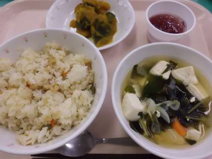 子ぎつねごはん・牛乳・すまし汁・かぼちゃの含め煮・あじさいゼリー