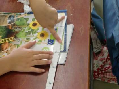 長さの単元です。前回作った「マイ定規」を使って、身の回りの物の長さを測ります。
