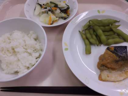 ごはん・牛乳・魚のピリ辛ソースかけ・枝豆・野菜の甘酢かけ