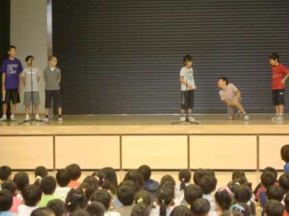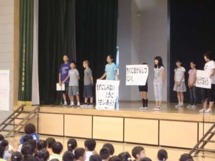 今朝の児童集会は保健委員会児童による「保健室の使い方」の発表でした。寸劇や三択クイズで楽しみながら保健室の利用方法を学びました。