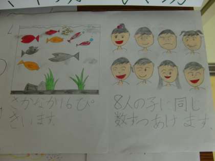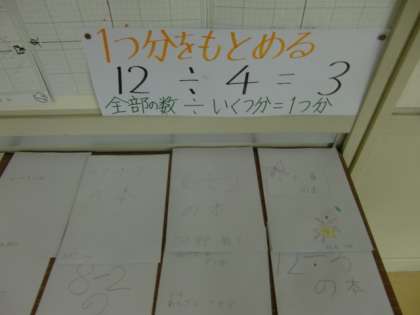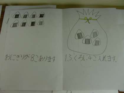算数でわり算の学習を続けてきました。わり算の文章題2種類を自分で考え、絵本の形にまとめました。