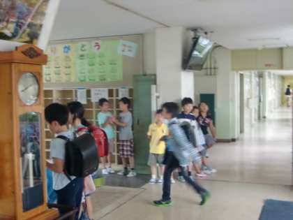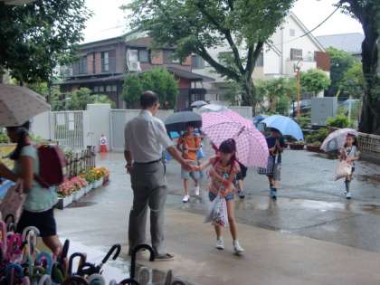 雨の朝です。傘をさして子どもたちが登校してきます。校長先生と握手をします。あいさつ当番の元気な声が聞こえてきます。