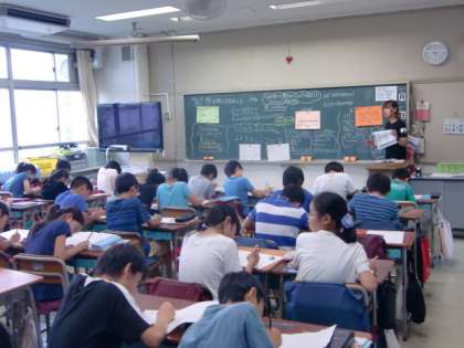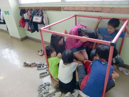 体積の学習も進んできました。廊下に設置されている1㎥の中に何人入れるかチャレンジしています。12人入ることができました。