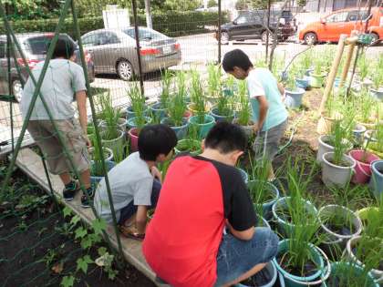 晴れた日の休み時間には、多くの児童が稲の様子を見に集まってきます。