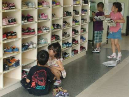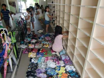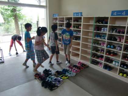 掃除の様子をご紹介しましょう。げた箱掃除をするときは、靴をきちんと並べて、小ぼうきで砂を掃きとっています。