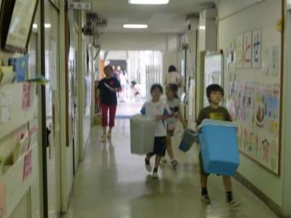 ゴミ捨て当番がゴミ箱を運んでいます。