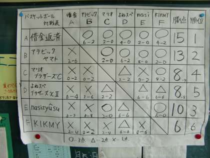 5年4組のバスケットボールの対戦表です。チーム名が面白いですね。