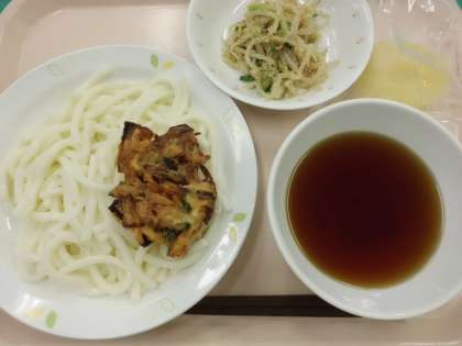 冷やしつけめん・牛乳・かきあげ・ごま酢かけ・くだもの