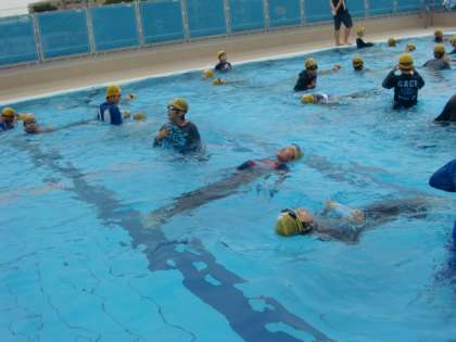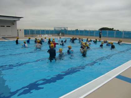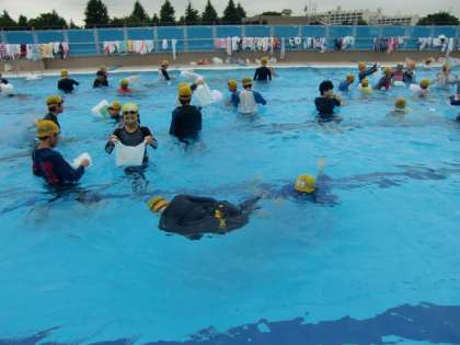水の事故はプールだけでなく、むしろ川や湖、海でも起こります。服を着ている状態で水に入った時の状態を体感し、どのようにしたらよいのかを知ることをねらいにして、6年生が着衣泳の学習を行いました。