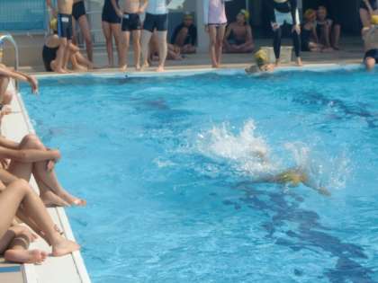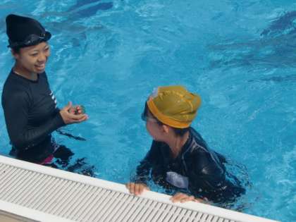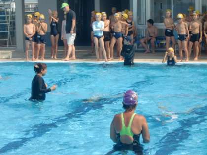 夏季水泳指導4日目。毎週金曜日は検定日です。写真は高学年の様子です。目標をクリアするとその場で輪ゴムをもらい、後で級章と交換します。