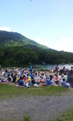湯ノ湖畔での昼食です。たくさん歩いたので美味しく食べられる事でしょう。