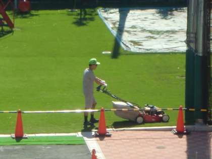 この時期は、朝にたっぷり水をあげること。夏芝は生育が盛んなので、週一回は芝を三分の一程度刈る必要があるのだそうです。校長先生自ら芝を刈っています。