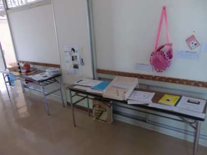 各教室の廊下に子どもたちが夏休みに取り組んだ自由研究が並べられています。