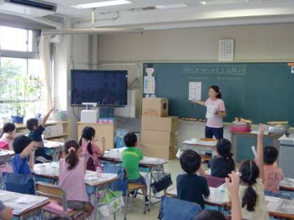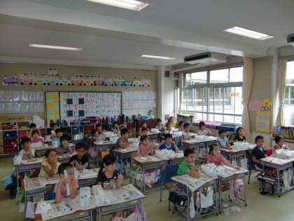 1年4組は図工。絵の具用のバケツやパレットの使い方を学習しています。