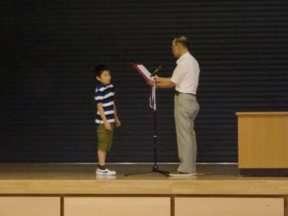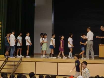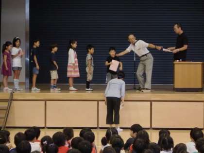 まず、夏休みの水泳指導18回に休まず通った子どもたちに皆勤賞が渡されました。